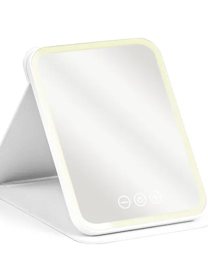 Miroir de maquillage avec étui pliable, lumière LED froide, normale et chaude. 5 niveaux d'intensité.