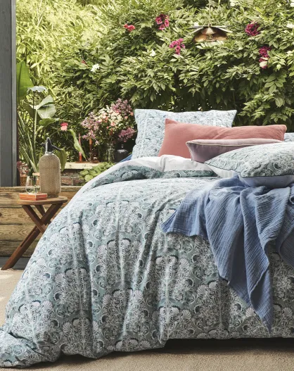 Palma - Parure de lit imprimée en percale de coton, taies carrées bleu