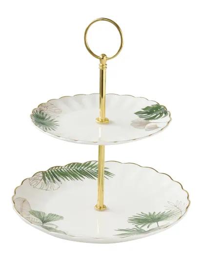 Plat à gâteau deux étages en porcelaine EXOTIQUE blanc/vert - D.16/21 cm