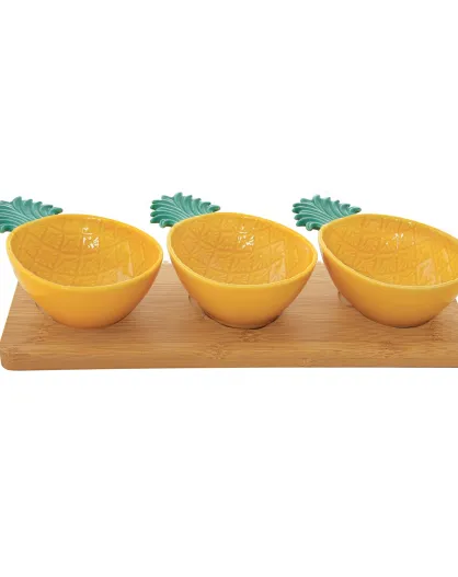 Service à apéritif avec plateau et 3 bols en porcelaine Ananas MADAGASCAR jaune
