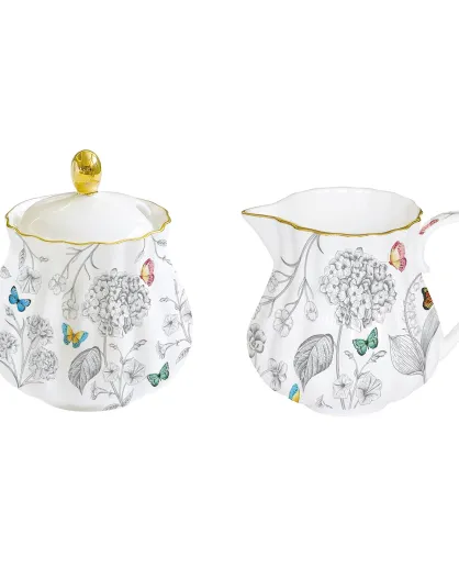 Pot à lait et sucrier en porcelaine FLEURS ET PAPILLONS multicolores