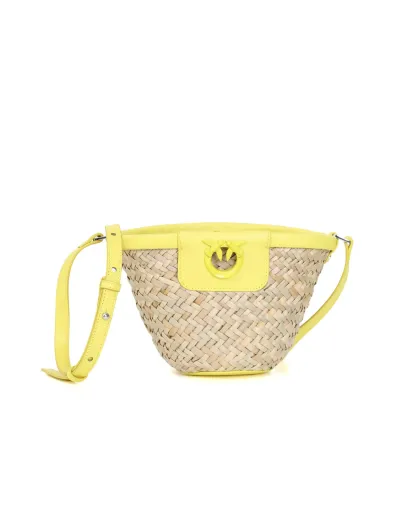 Sac de plage Seau Love Summer en raphia et veau soyeux beige/jaune - 17x14x10 cm