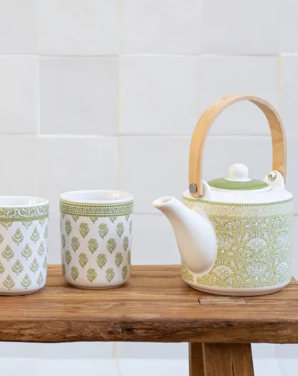 Lot de 2 tasses et 1 théière avec infuseur Soliman en porcelaine vertes - 6,5x7 cm