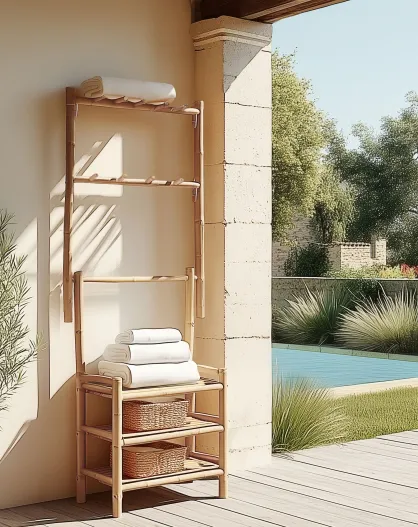 Etagère 3 niveaux et porte-serviettes en bambou - 69x36x187 cm