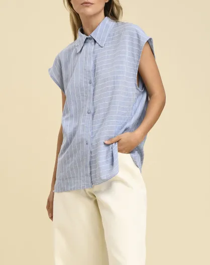 Chemise 100% Lin sans manches Col bleu moyen