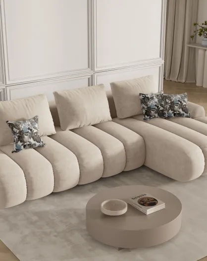 Canapé d'angle droit velours convertible avec coffre de rangement Simona 4 places beige clair - 275x142x84 cm