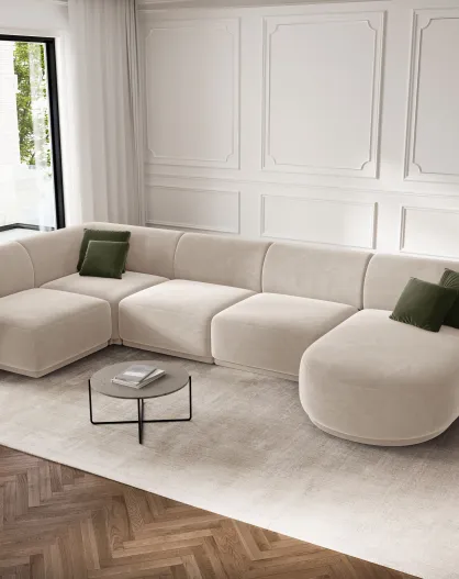 Canapé d'angle panoramique (côté gauche) velours Louis 6 places beige - 336x166x74 cm