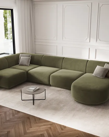 Canapé d'angle panoramique (côté gauche) velours Louis 6 places vert - 336x166x74 cm