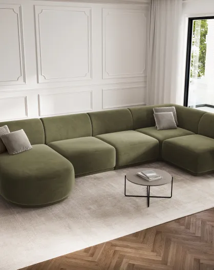 Canapé d'angle panoramique (côté droit) velours Louis 6 places vert - 336x166x74 cm
