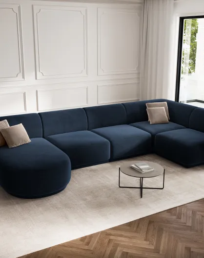 Canapé d'angle panoramique (côté droit) velours Louis 6 places bleu roi - 336x166x74 cm