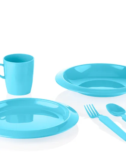 Set assiette plate + assiette creuse + petit verre + petites couverts bleu mat - 23,5x6,8x27 cm