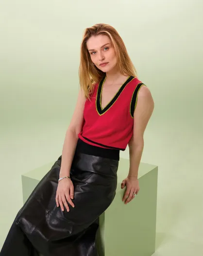 Pull sans manches encolure en rib raye en coton Zola rouge