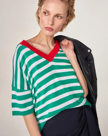 T-Shirt Col V Raye en coton Nawal vert emeraude