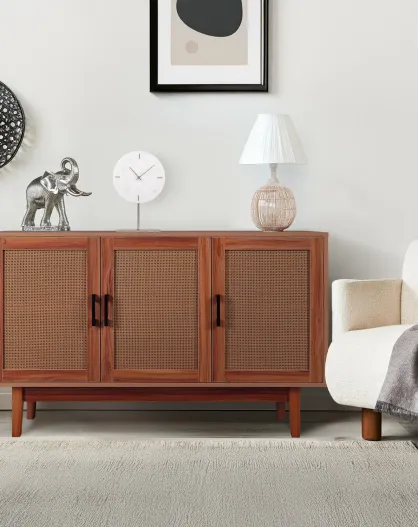 Buffet moderne poetis 3 portes avec cannage rotin et bois - 113x40x70 cm