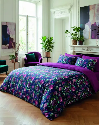 Drap plat satin de coton Arty flowers bleu foncé